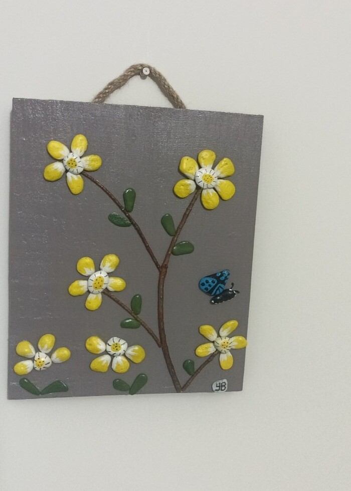 Ahşap üzerine çakıl taşları ile yapılan tablo. En 18, boy 22 cm. Mekanlarınıza renk katacak.