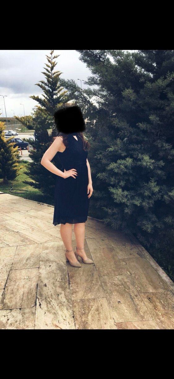 Lacivert simli halter yaka(boğaz kısmı bağlanıyor) tül elbise. İçi astarlıdır. Sadece bir kere kullandım. Hiç bir sorunu yoktur.