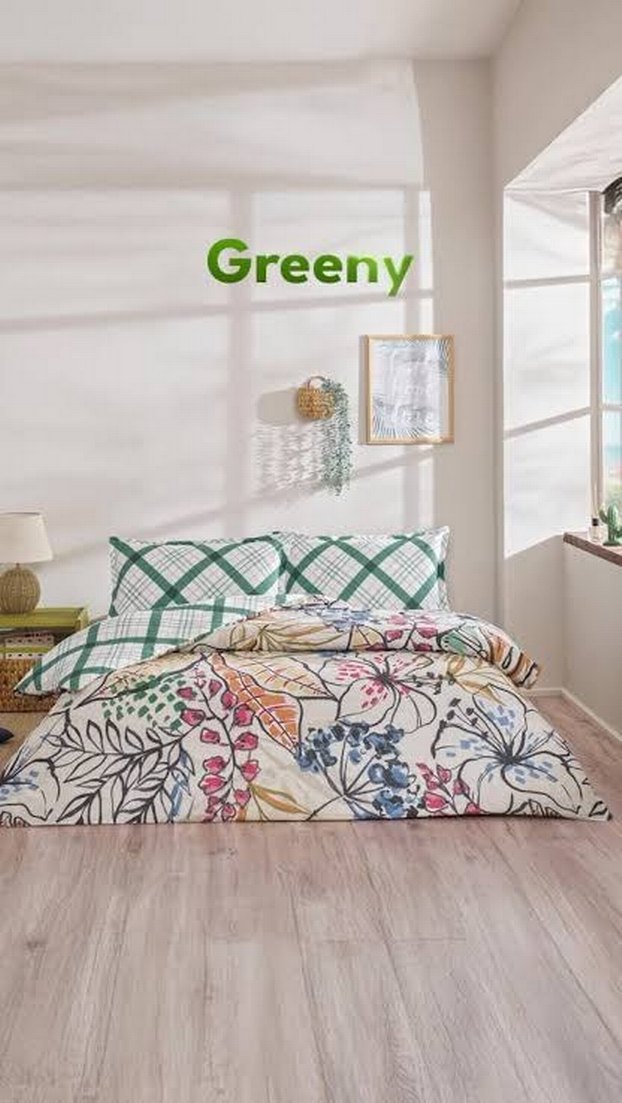 Hafif çok renkli çiçek desenli, yumuşak kumaşlı nevresim takımı. Yeşil beyaz ekoseli yastıklar ve canlı çiçek desenli nevresim içerir.