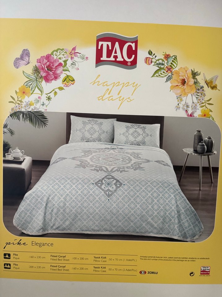 Hediye geldi hiç kullanılmadı. Bir adet pike iki adet yastık kılıfı bir adet lastikli çarşafı bulunmaktadır.