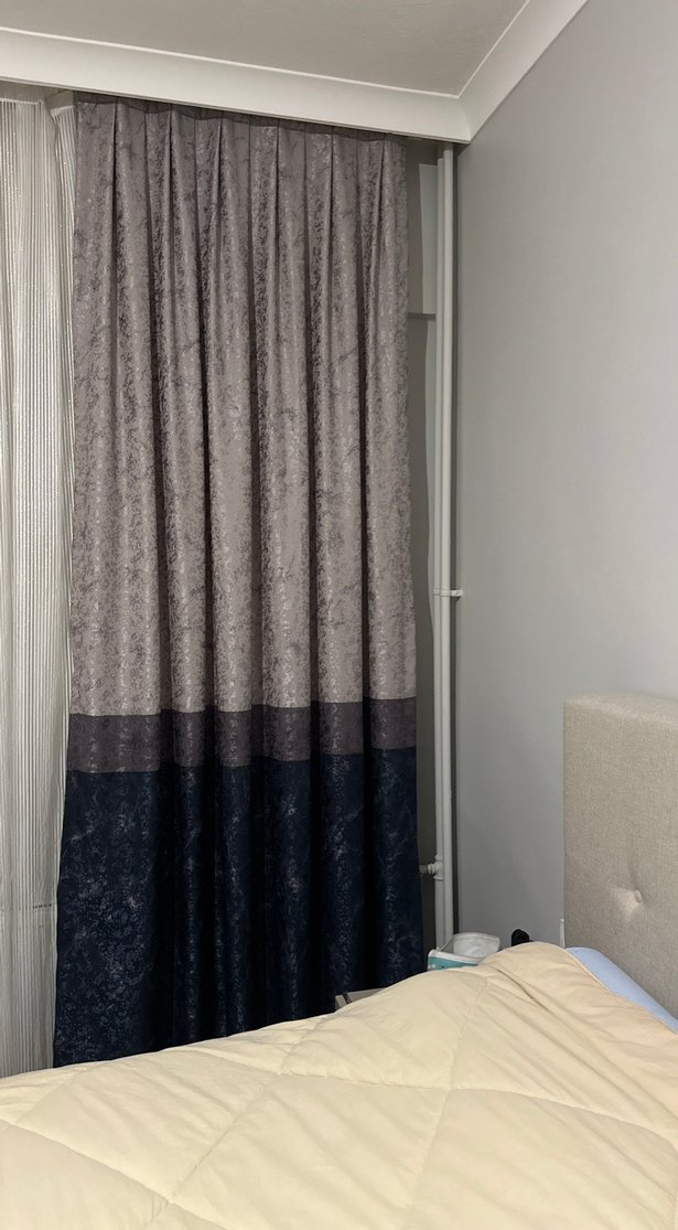 Gri ,füme ve lacivert renkte, modern klasik tarzda, tie-dye desenli perde.Üç tonlu yapısıyla odaya derinlik ve doku katıyor. Kırışma yapmayan oldukça kalın dokulu taç perde fon en 90 boy 2.72