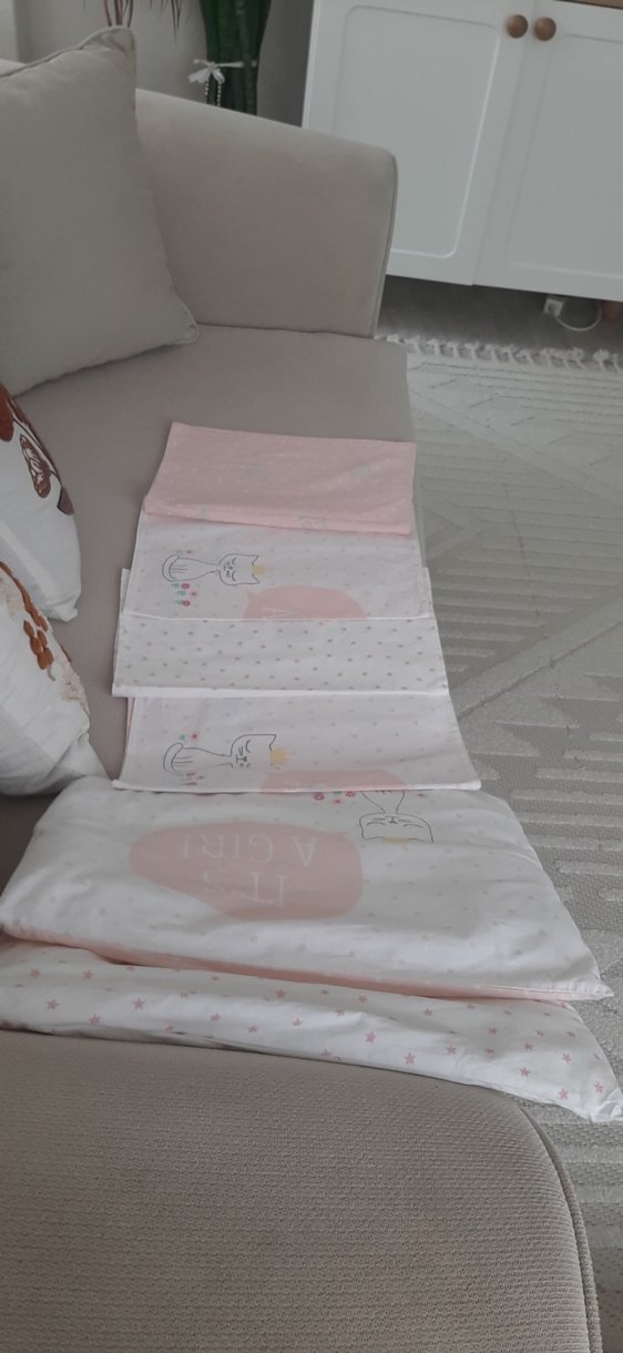 Yumuşak pamuktan yapılmış, pastel pembe renkli ve nazik baskılı desenlere sahip çocuk yastık yüzleri hepsinin fiyatıdır 5 adet yastık mevcuttur istediğinizi alabilirsiniz