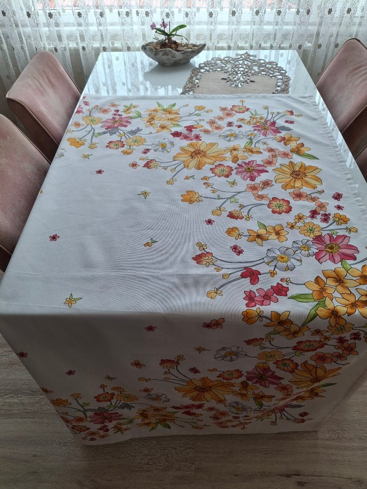 Beyaz zemin üzerine renkli çiçek desenleriyle süslenmiş masa örtüsü, masanıza ferah bir görünüm kazandırır.
