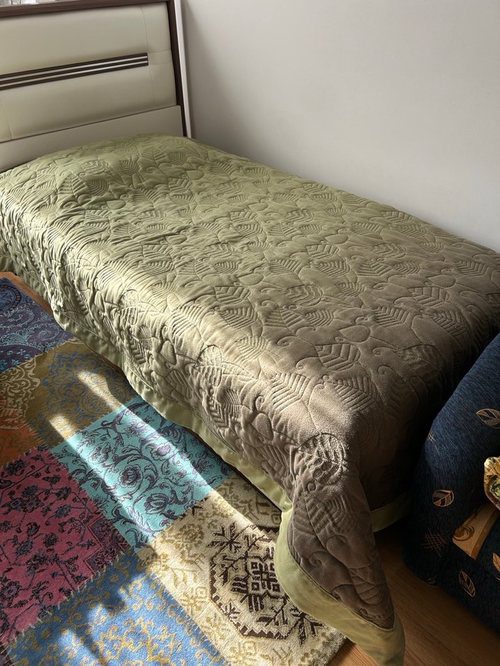 Yeşil renkli, kabartmalı desenli yatak örtüsü, tek kişilik yatağa uygundur. Bazı yerlerinde tüylenmeler vardır. 1.80 x 2.60 ölçülerindedir.