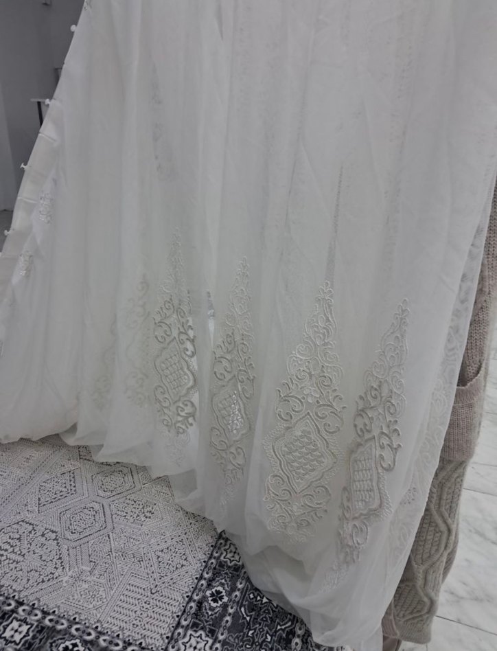 tarzda, yumuşak gri tonlarda işlemeli beyaz perde, mekana zarif ve sanatsal bir dokunuş katar. En 340 boy 247 hazır
