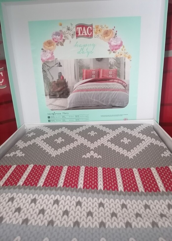 Taç Ranforce Merry Çift Kişilik Nevresim Takımı. Ürünlerimizin tamamı sıfır kendi ambalajında orijinal ürünlerdir mağazamızdan tarafınıza gönderilecektir. Ürün Bilgileri : 200x220 cm Nevresim + 240x260 cm. Lastikli çarşaf + 2 adet 50x70 cm Yastık Kılıfı. Yüzde yüz Pamuktur. Ranforce kumaşıdır sıfır kutulu üründür
