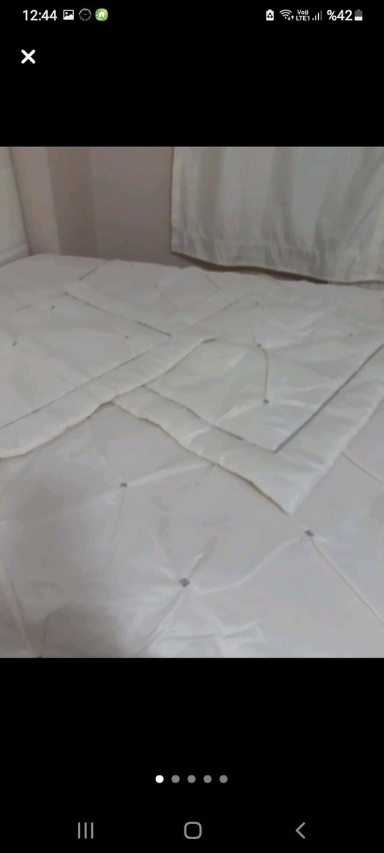 tac marka yatak örtüsü kirem renk detayı taş işlemeli tafta saten kumaş ağır gramajli büyük boy 2 adet kirlent 1 adet yatak örtüsü yeni sayılır ürün fazla kullanılmadı yırtık sökük leke vs yoktur ihtiyaç fazlası ürün.