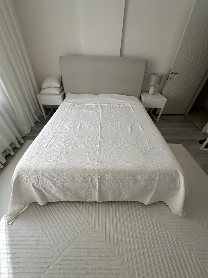 Çeyiz seti olarak almıştım. 3-4 defa serdim. Kullanmıyorum bu sebeple satıyorum. eni etek ucu 216 cm, üst taraftan 208 cm. Üst tarafında işleme olduğu için, doğal olarak cm farkı var. Boyu 246 cm. Kırık beyazdır. Takımın pamuk saten nevresimi de var. İsteyen olursa ekleyebilirim.