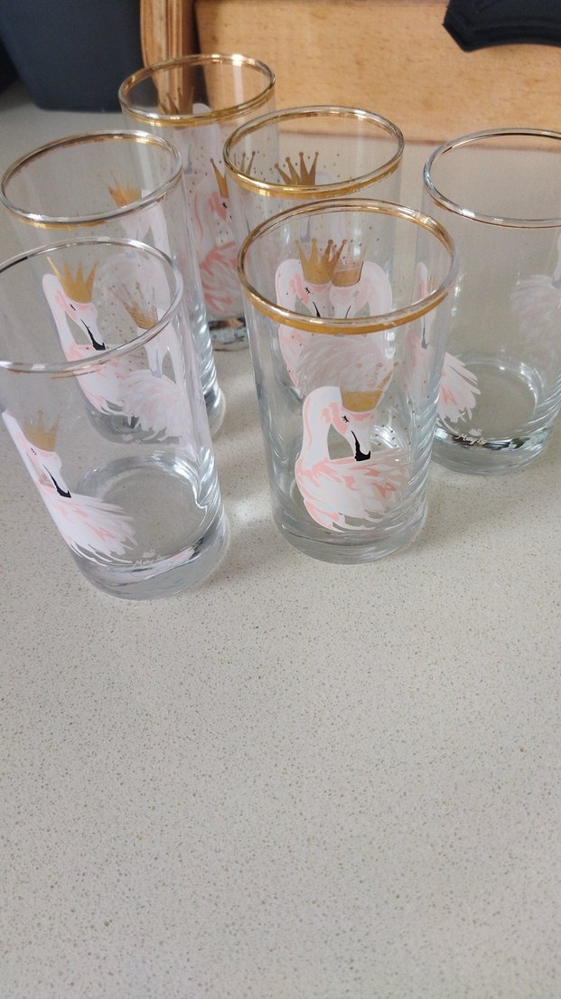 Altın rengi kenarlıkları ve taçlı kuğu desenleriyle pastel beyaz şeffaf bardaklar, içecek sunumu için uygundur. Kenar yaldız kısımları soyulmuştur.