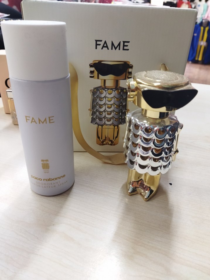 Taco Rabanne Fame kadın parfüm seti, özel tasarımlı altın ve gümüş renkli figür şişe ve sprey içerir.
