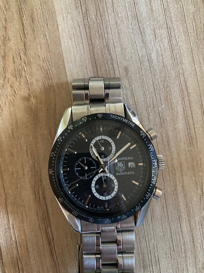 TAG Heuer Carrera erkek saati, siyah kadran, kronograf alt kadranlar ve takimetre çerçevesi ile. Gri metal bilezik ve otomatik mekanizmaya sahiptir. ⌚