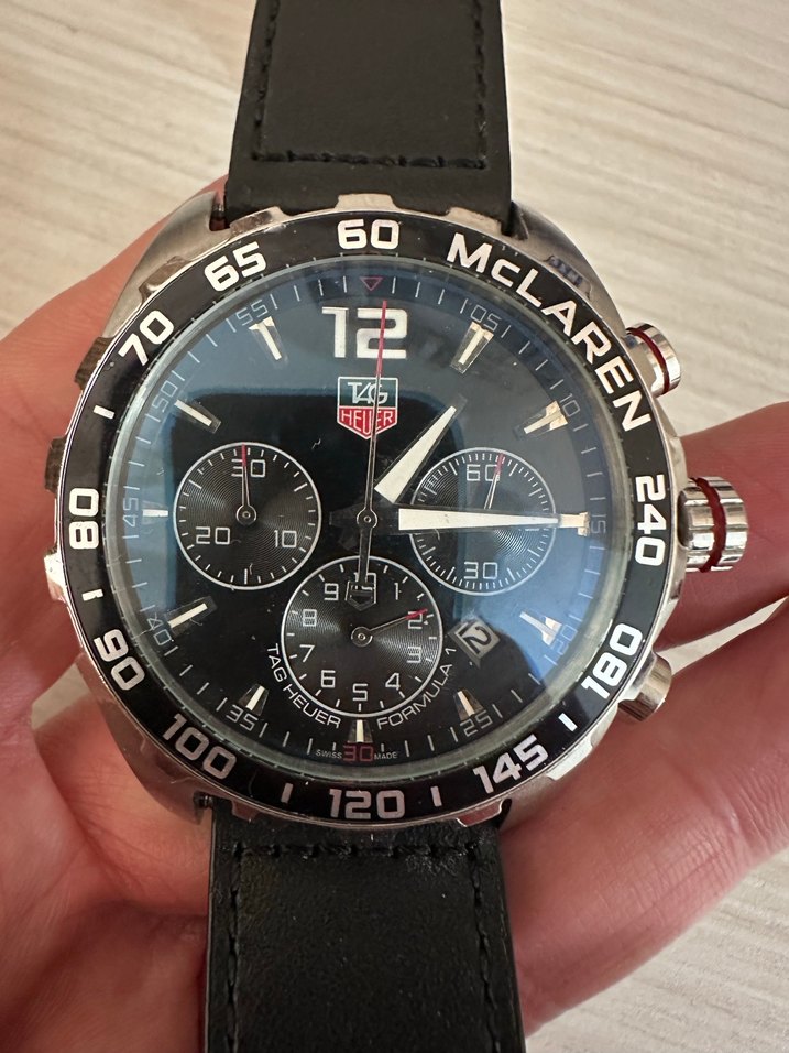 TAG Heuer McLaren erkek saati, kronograf özellikli siyah kadran ve siyah deri kayış ile klasik biker tarzını yansıtıyor. Çok kaliteli replika iç kadran tümü hareketli temiz