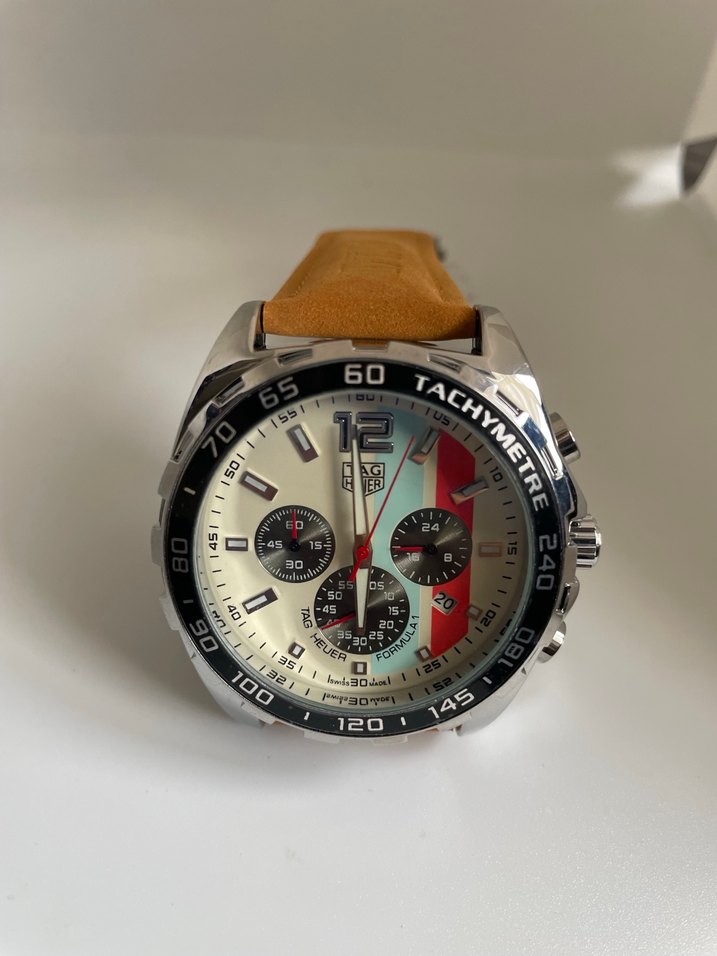 Bej klasik erkek kol saati, açık renk deri kayış ve takimetre çerçeveye sahip. Çoklu kronograf kadranları ve çağdaş tasarımı bulunur. ⌚