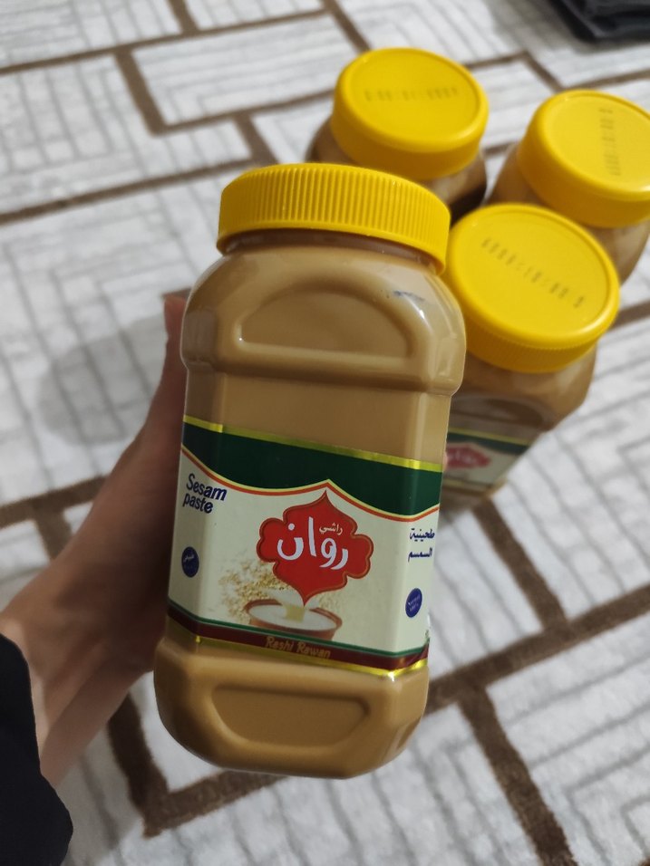 Sarı kapaklı kavanozda, üzerinde Arapça ve İngilizce yazılı, pürüzsüz susam ezmesi bulunuyor.
