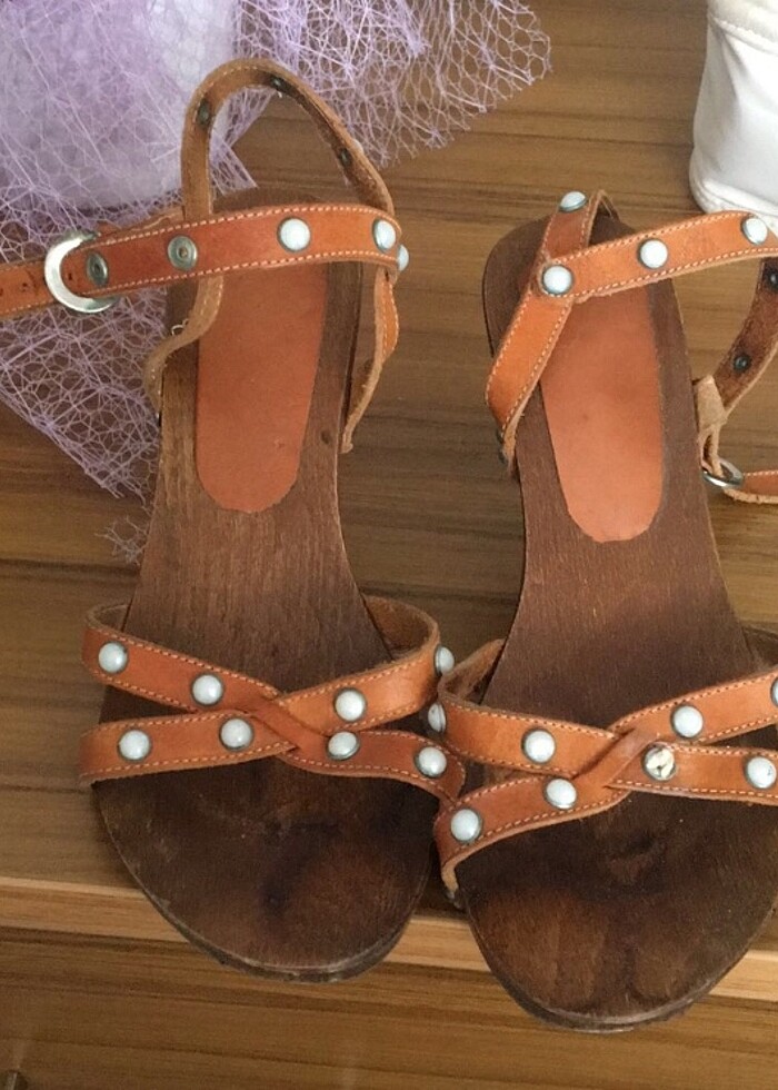 Tahta deri ve boncuk detaylı ince demir topuklu altında lastik tabanı olan bir ayakkabı çok rahattır severek giydim alana hayırlı olsun bir boncuğu düşmüştür giymeye bağlı deformasyonu vardır.