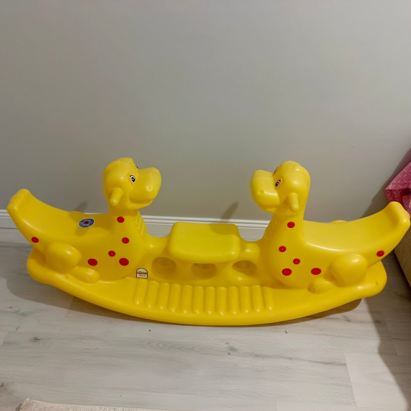 Sarı renkte, kırmızı benekli iki köpek figürlü, çocukların birlikte oynayabileceği kaydıraklı salıncak. Altı kavisli hareket sağlar.