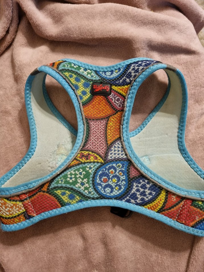Tailpetz Canlı desenli ve açık mavi kenarlıklı renkli köpek göğüs tasması, konfor ve şıklık sunar.
