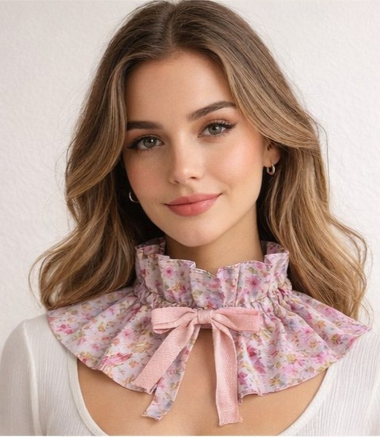 Pembe renkli, çiçek desenli ve fırfırlı detaylara sahip tak çıkar boyunluk