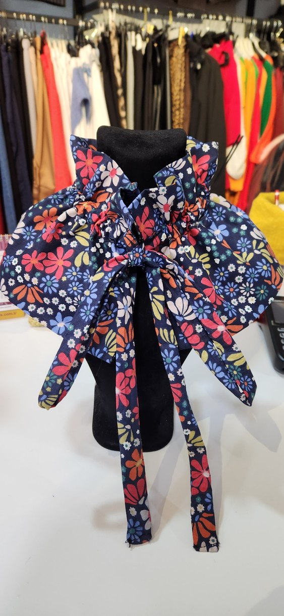 Renkli tekstil fular, fırfır detaylı ve bohem çiçek desenli, avangart tarzı sevenler için ideal. Elbise kazak tişhortlerinize hava katacak ürün