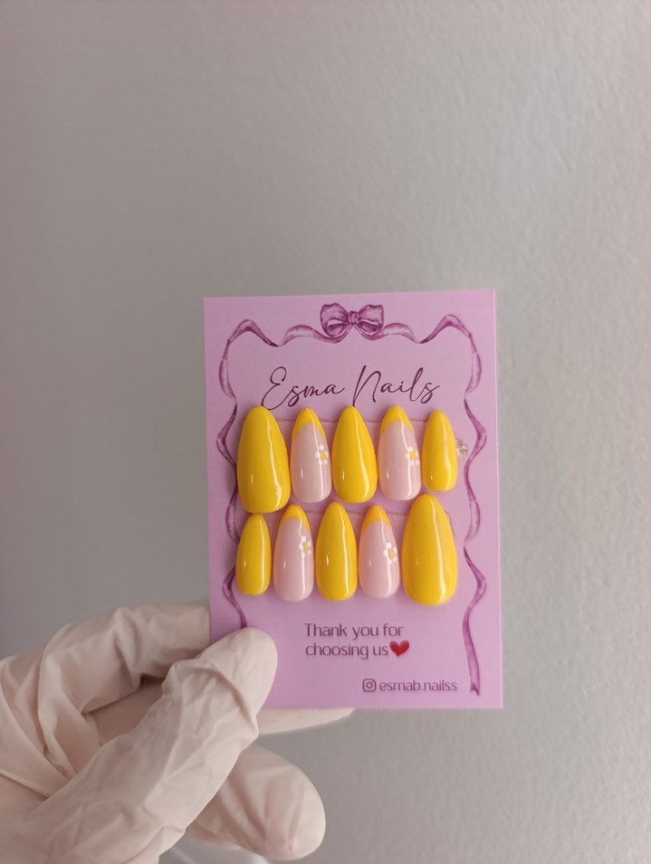 Pastel sarı ve ten rengi jel takma tırnaklardan oluşan, farklı boyutlarda kolay uygulama sağlayan set. Parlak ve pürüzsüz yüzeye sahip.