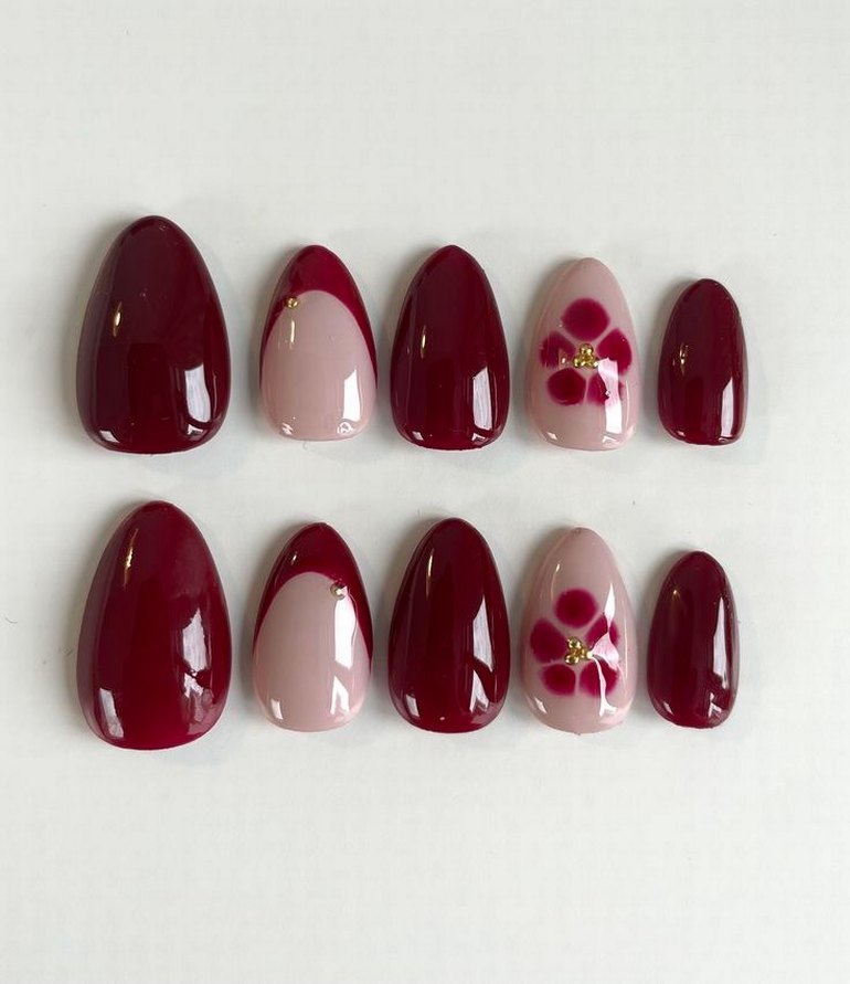 Koyu bordo ve yumuşak pembe tonlarda, çiçek desenli ve küçük altın detaylı tırnak süsü seti. Portakal çubuğu ve yapıştırıcı hediyeli