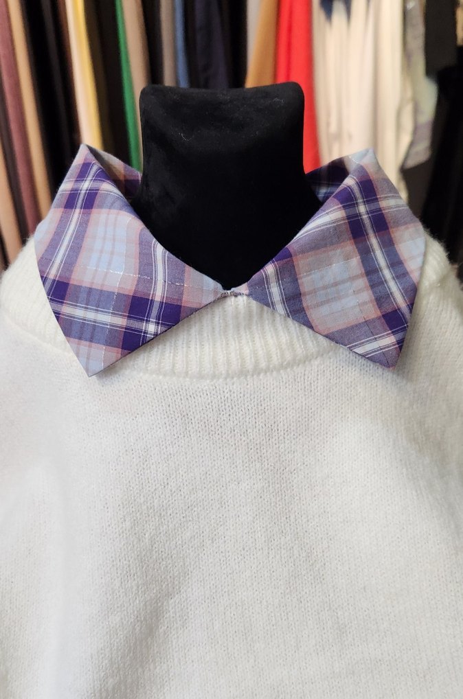 Mor ve gri ekose desenli, bağlama efektiyle sokak modası ve vintage Paris tarzını birleştiren tak çıkar yaka... El emeği Renk sorunuz