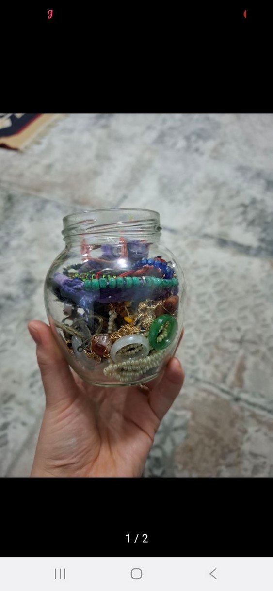 Cam kavanozda, boncuklu bilezikler, yüzükler ve zincirler gibi çeşitli el yapımı takılar bulunuyor.gold silver renkli takılar mevcut. süpriz takılarda var. içerisinde 20 ürün var. doğal taşlılarda var fiyatı uygundan veriyorum
