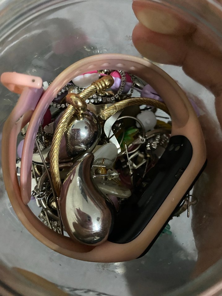 Açık pembe renkli ince bileklik ve çeşitli metalik takı parçalarından oluşan set. Gümüş ve altın tonlarında, parlak yüzeylidir.