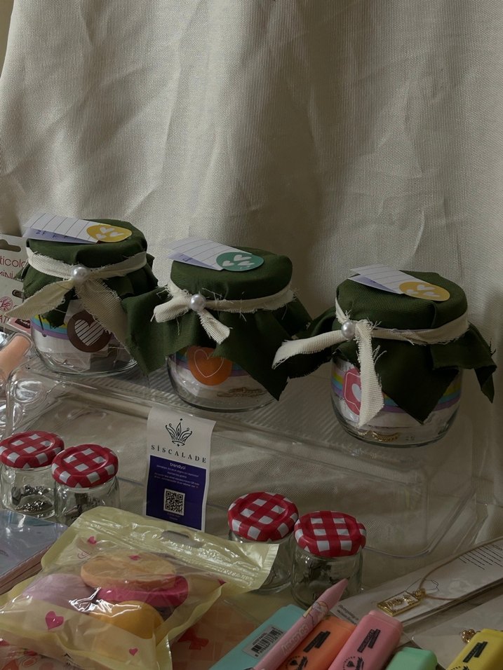 İçerik; Çelik kolye , küpe, bileklik, figür oyuncaklar,ışıklı tokalar ve daha bir çok ürün bu kavanozda !