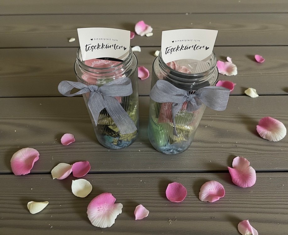 Gri kurdele ile bağlanmış, pastel tonlarda çok renkli takı kavanozu içinde şık takılar bulunuyor.