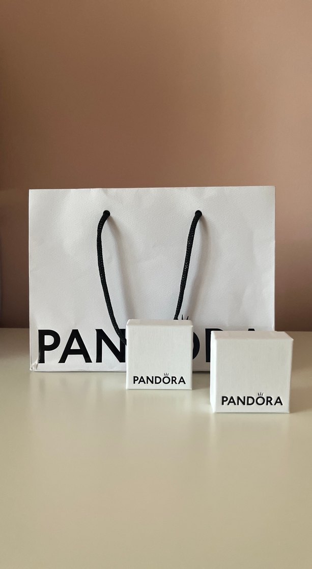 Pandora logosu bulunan beyaz kağıt çanta ve iki küçük beyaz kutu, çantada siyah saplar bulunuyor.