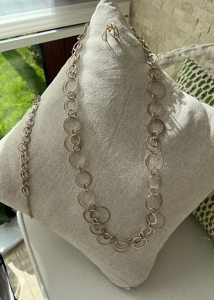 Kolye, küpe ve bileklikten oluşan üçlü set İspanya’dan alınmıştır. Herhangi bir renk kararması veya kusuru yoktur. # kadın #takı #bijuteri #küpe #kolye #bileklik