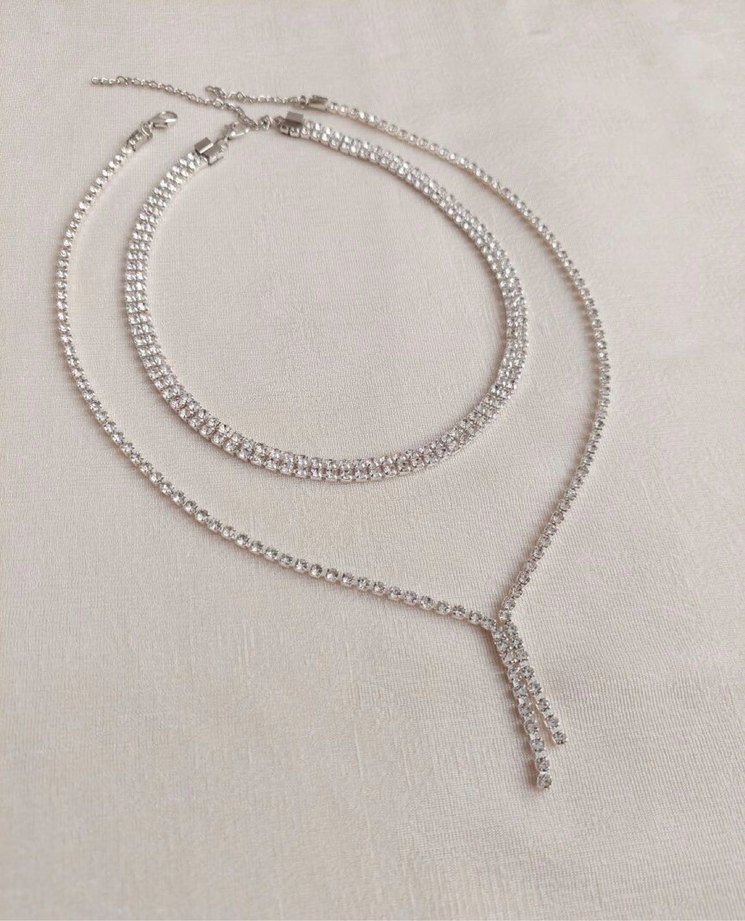 Kristal taşlı çift sıra choker kolye, su yolu kolye, çift sıra küpe, çift sıra bileklik. Sıfır paketli ürün.