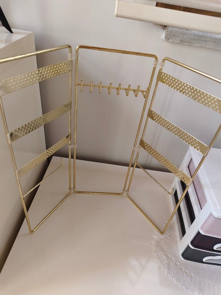Parlak altın renkli, çoklu bölme ve askılara sahip takı organizeri. Katlanabilir yapısıyla takılarınıza kolay erişim sağlar. ✨