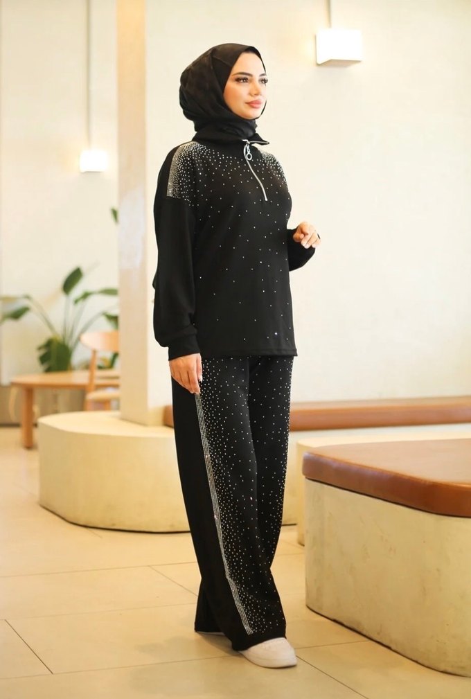 Kadınlar için uzun kollu, bol kesim ve yüksek yakalı takım. Yumuşak ve sıcak kumaştan, koyu siyah renk, payet detaylı ve hafif batik desenlidir. Günlük kullanıma uygundur. ✨