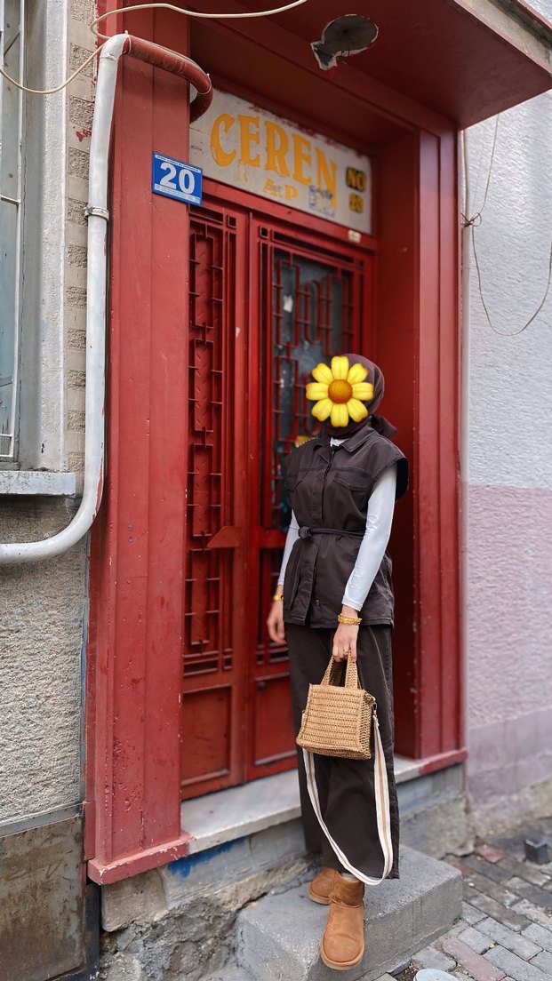 Çok kullanılmadı Kemerli, yüksek yakalı, etnik desenli, sentetik kumaştan yapılmış, salaş kesim ve midi boy sleeveless camel takım. Sokak stili için uygun.