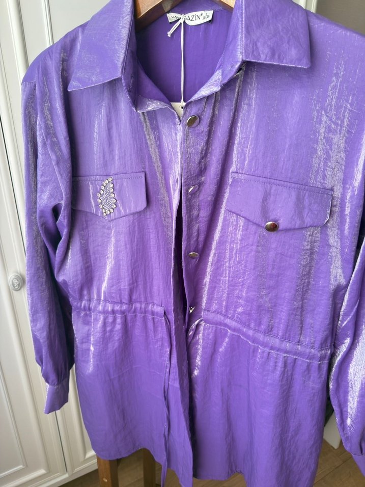 Parlak mor renkte, düğmeli lapel yakalı kadın gömlek ceket ve pantolon.