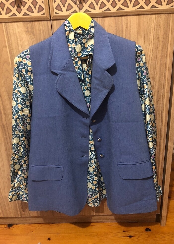 Özel dikim etek+gömlek+yelek takımı. 42-44 bedene denk gelir. Gömleğim omuzları vatkalıdır. Gömleğin kumaşı ipektir. Etek ve yeleğin ise cottondur. 1 kere giyildi
