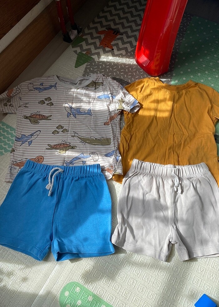 2 şort 2 tişört Şortlar ebebek marka krem rengi şortta minik bir leke var