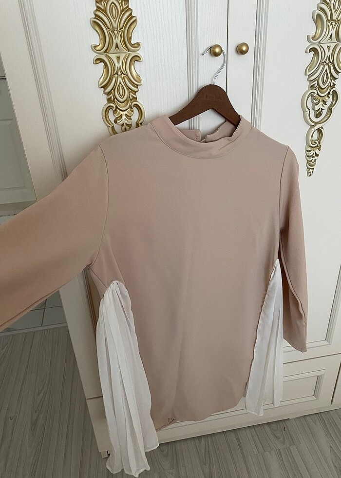Bej rengi ikili takım pantolonlu yanlarında pile detayı var etiketi yok ama yeni hiç giymedim 36 38 uyumlu 1 beden ciddi alıcılarda pazarlık olur