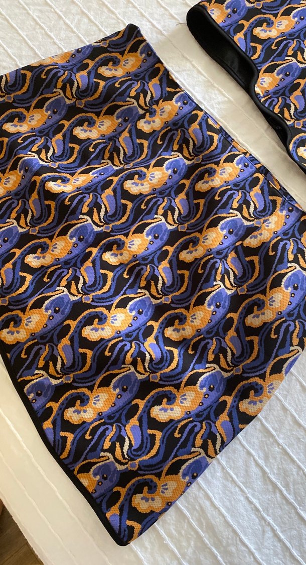 koyu renkli çok renkli yılan desenli ve pliseli tasarıma sahiptir. Düzenli kesim ve uzun boyda, çağdaş ofis kullanımı için uygundur.