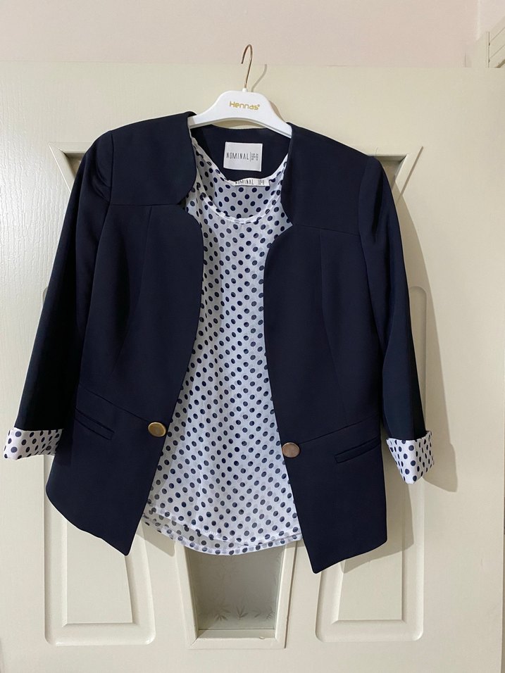 Düğmeli, yakalı kadın blazer, siyah beyaz puantiyeli desenli. Normal kesim, uzun kollu ve pantolonlu takım.