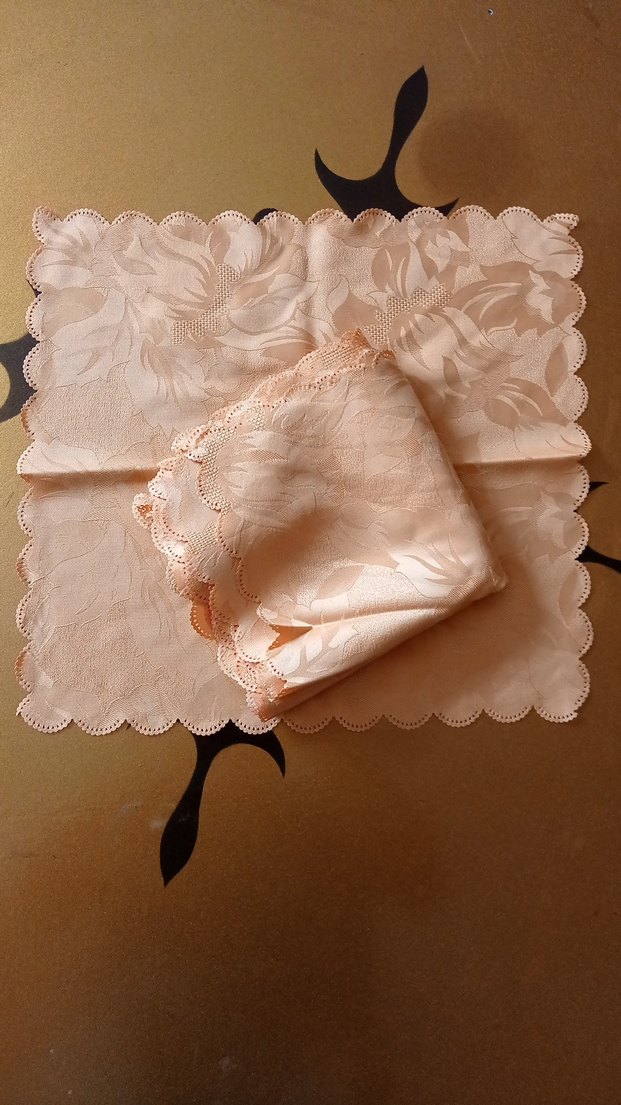 Koyu somon, kayısı renkli masa örtüsü,kendinden çiçek desenleri ve dalgalı kenarlarıyla masanıza zarif ve yumuşak bir dokunuş katıyor. 40x40 ebadında altı adet takım fiyatıdır. Açık yeşil, koyu mavi, koyu pembe(gül kurusu), bordo renkleri vardır.