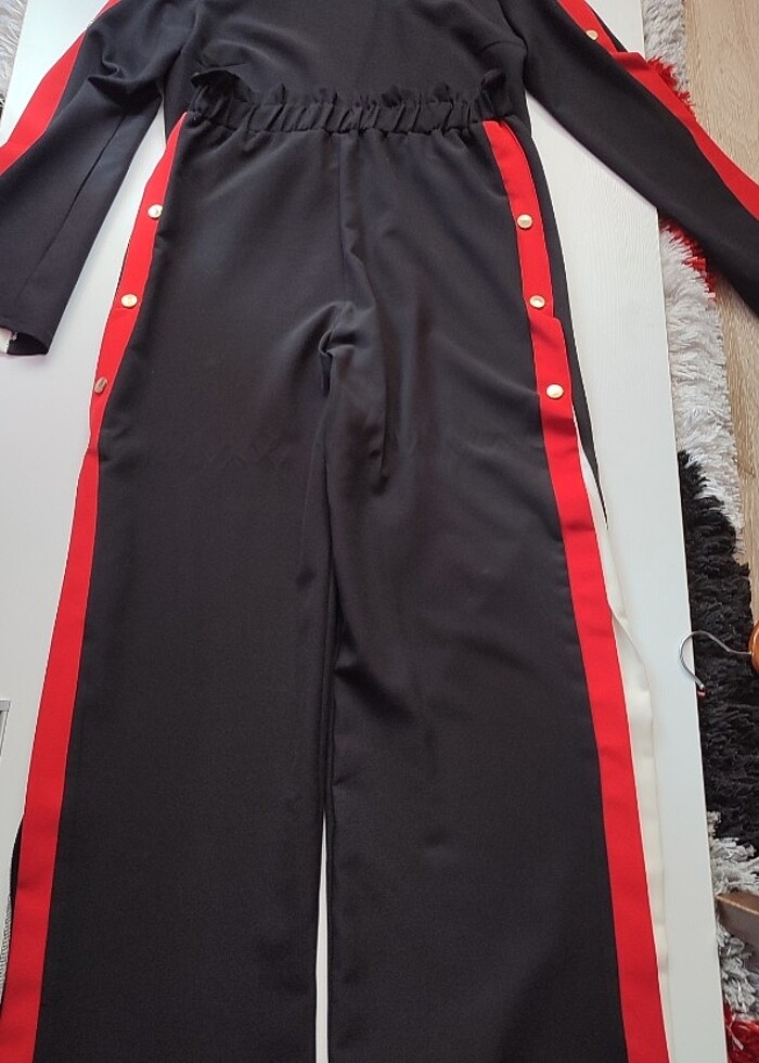 Bir defa giyildi.Hiçbir sorunu yok.Pantolon kısmı geniş kesim yandan yırtmaçlı.Üst bölümde kollardan yırtmaçlı.Çok tarz özel günler için de uygundur.