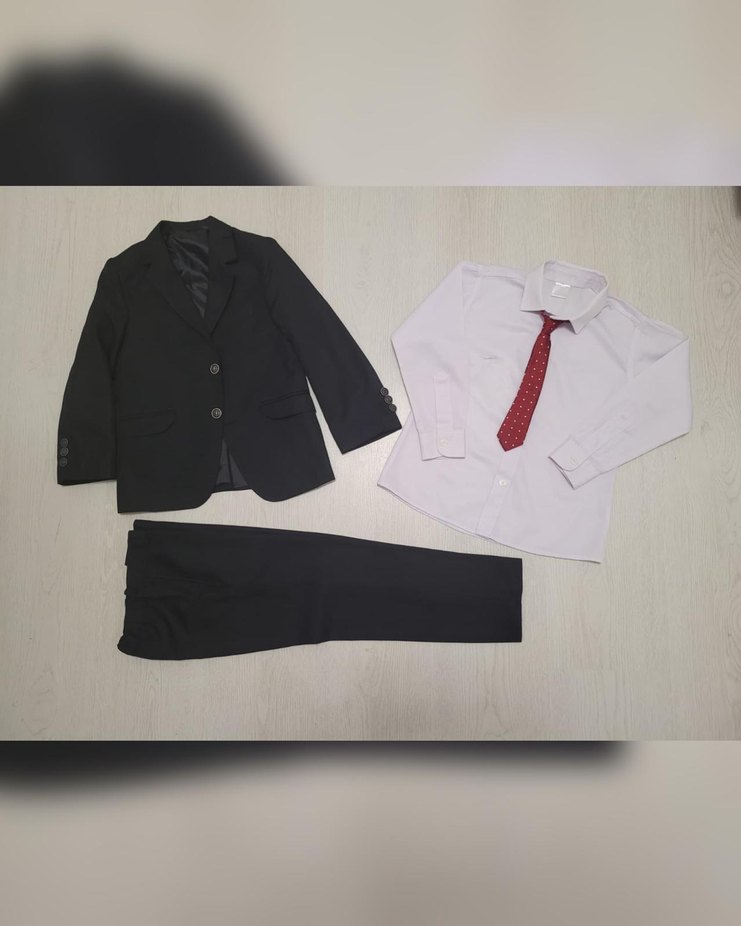 Emilio Rossi marka, punto dikişli, 6 yaş çocuk takım elbise. Ürün ceket gömlek pantolon ve kravat 4 parçadır. Gömlekte görünmeyen yerde ütü kaynaklı küçük Bir leke var kullanıma engel değil. Bir kez kullanıldı sıfırdan farksız. Markayı ve kumaş kalitesini bilen bilir yurtdışından alındı.
