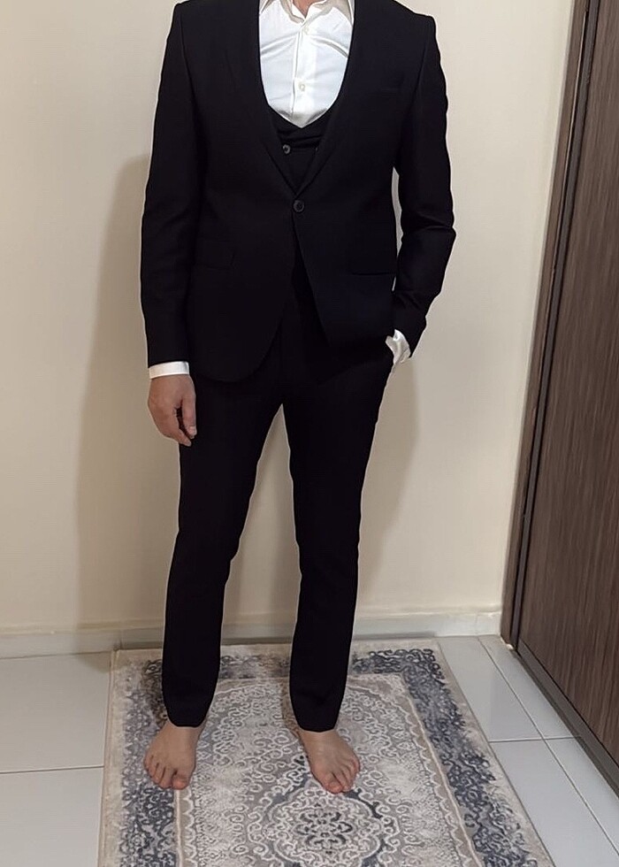 Ürün bir kere kullanılmıştır 46’ya altı drop dur rengi siyahtır gömlek temsilidir satılık değildir pantolon ceket yelek üç parça olarak gönderiliyor
