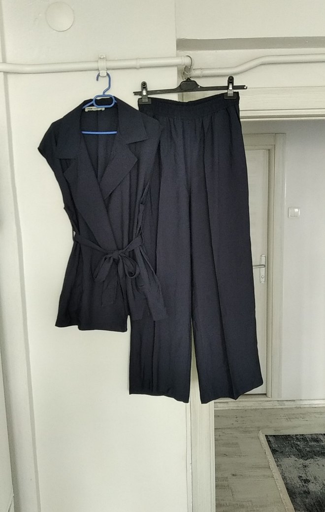 Lacivert 38 /40 /42 beden uyumlu yazlik pantolon ve yelekde cepler vardır pantolon bol kesim ve beli lastiklidir rengi soluk değildir