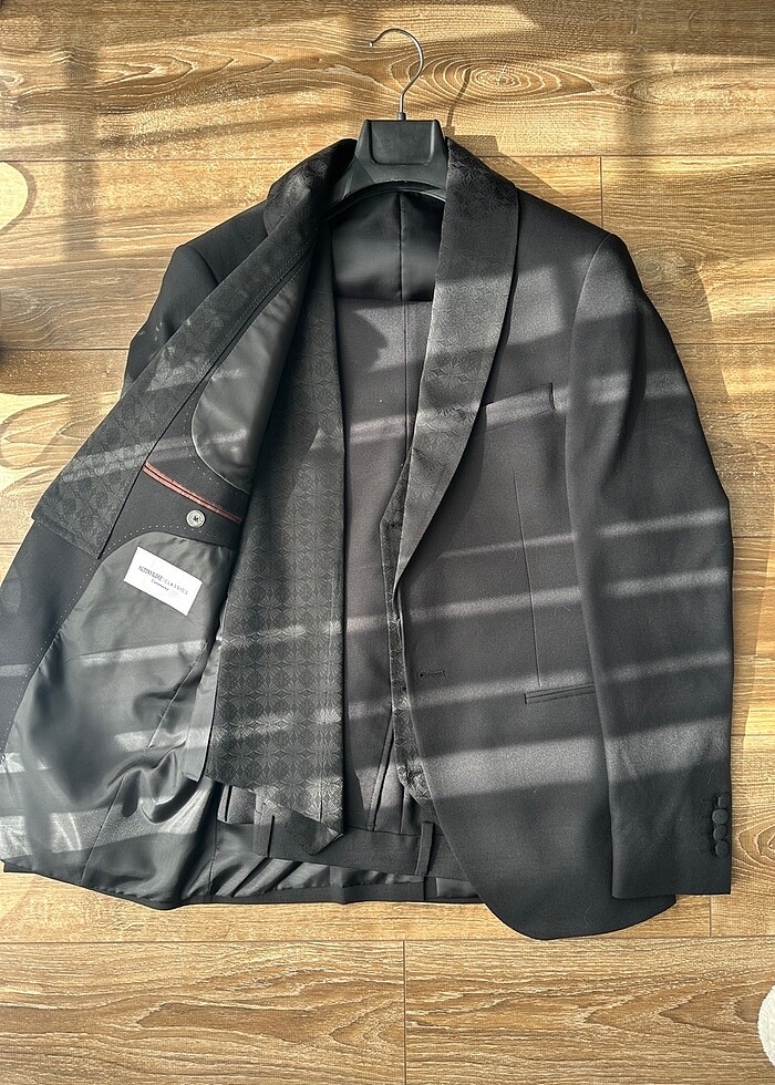 Ürün temiz bir kere giyildi yakası çıkabilir normal olarakda kullanılabilir. Ütü izi yırtık sökük yoktur pantolon bel 44 boy 100cm. Ceket kol altı 50 cm hesap no ile daha uyguna verilir