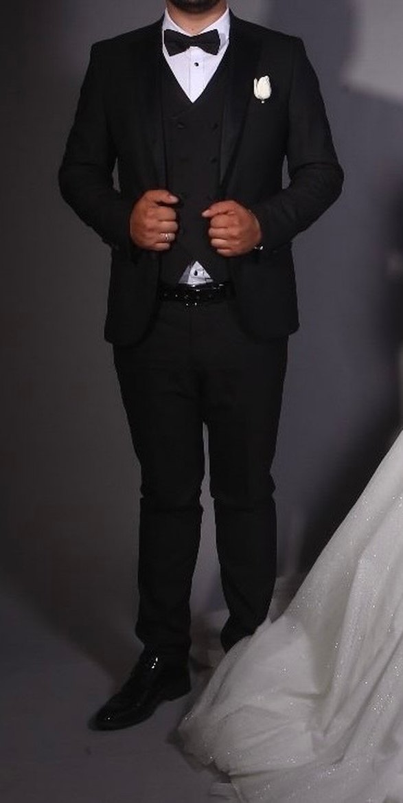 Siyah renkli,ceket, pantolon, papyon ,gömlek, kuşak(hiç kullanmadık) sadece düğünde ve aynı gün yapılan çekimde giyildi hiçbir kusuru yoktur.