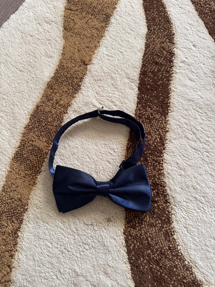 Sentetik kumaştan yapılmış, desen içermeyen koyu mavi takım elbise papyonu.